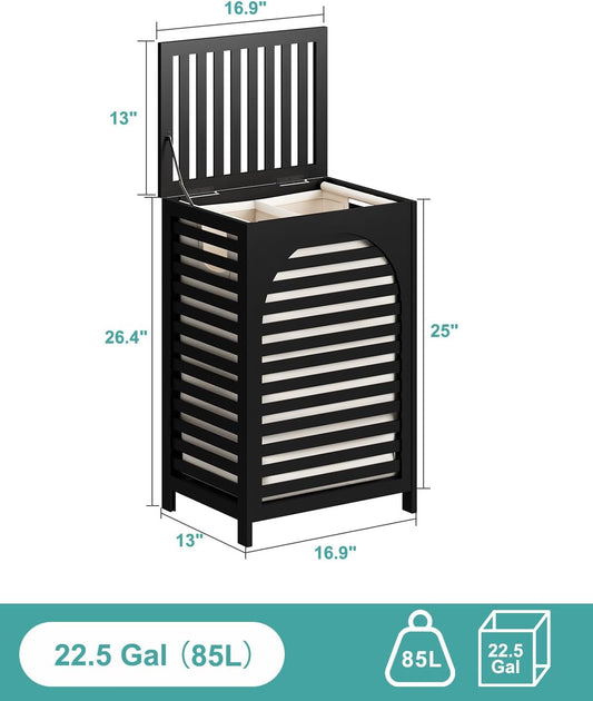 Black Laundry Hamper with Lid 22.5 Gallon (85L), Bamboo Wood